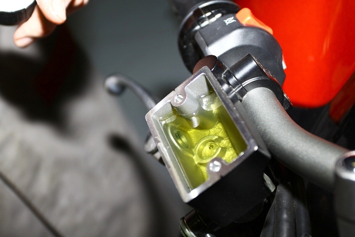 Brzdová kapalina se dá zkontrolovat vizuálně pohledem na nádržku\, motorový olej se kontroluje buď měrkou\, a to podobně jako u auta (přesný postup je popsaný v manuálu), nebo přes kontrolní okénko. To má výhodu – je možné se podívat i na barvu maziva. Mimochodem, pokud jste nevyměnili olej před koncem sezóny, udělejte to před začátkem té nové. Motoru tím jenom prospějete.